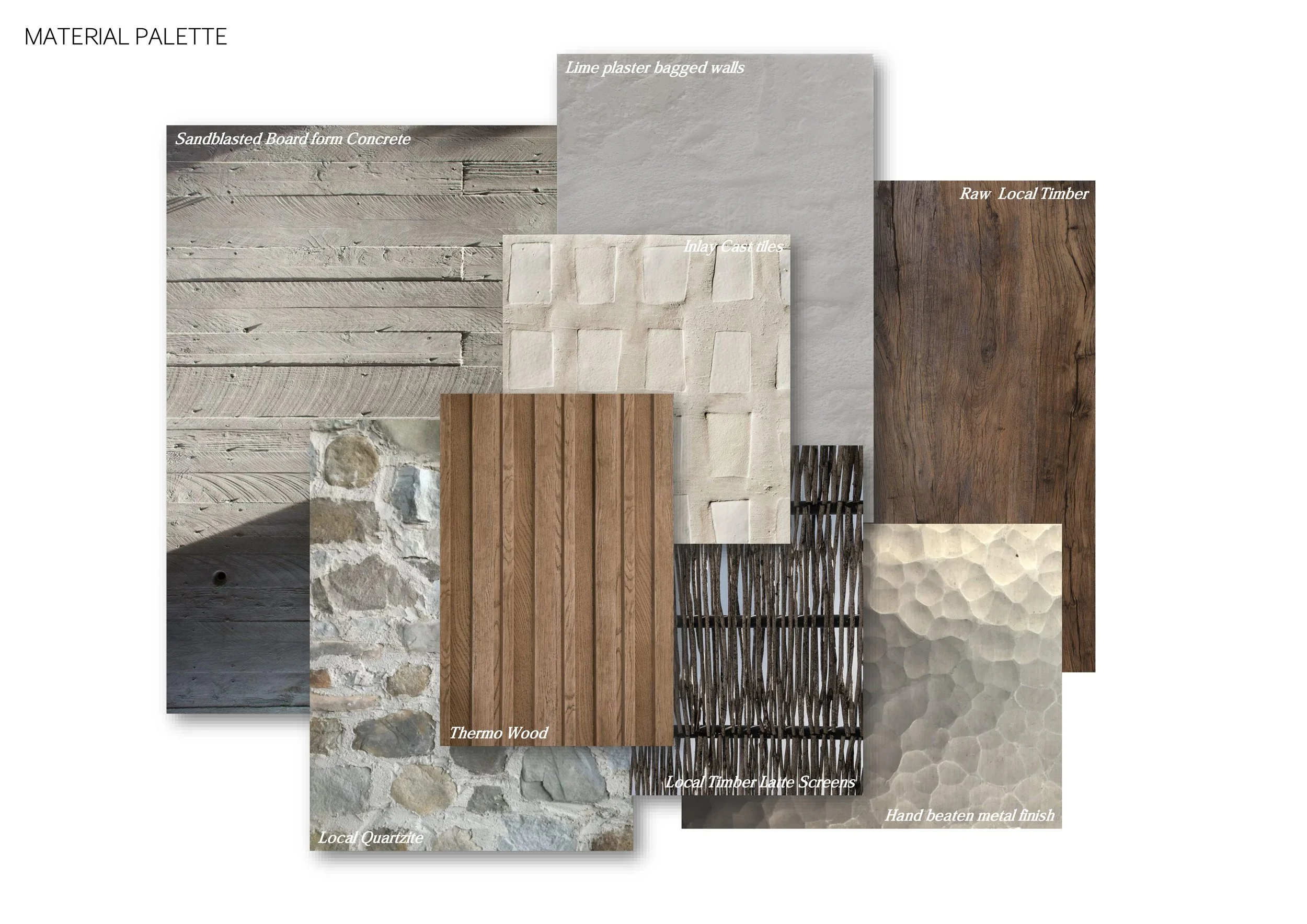 Each space is defined by material honesty and environmental restraint. Locally sourced quartzite, sandblasted board-form concrete, and lime-washed plaster form a palette that ages naturally within the arid climate. Deep walls provide thermal mass, shaded openings temper harsh sunlight, and cross-ventilation maintains comfort throughout the diurnal cycle.